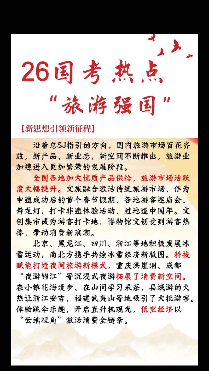中国政策如何影响本土旅游发展? 從「管控」到「引導」的雙軌並行 中國的旅遊政策核心目標通常是:(图片来源网络,侵删) 經濟引擎: 拉動內需、刺激消費、帶動相關產業(如交通、餐飲、酒店、零售)。 社會穩定: 管理人口流動、保障公共安全、傳播主流價值觀。 國家戰略: 推動區域協發展(如西部大開發、京津冀協同)、促進文化自信、塑造國家形...