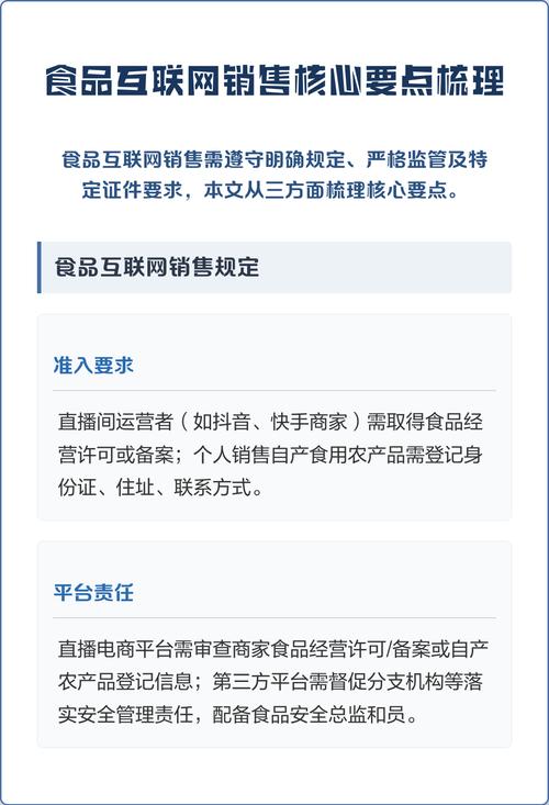 互联网销售食品新政策,对商家和消费者有何影响? 国家市场监督管理总局(SAMR)于2025年12月发布了《网络直播营销管理办法(试行)》和《网络交易监督管理办法》等一系列法规,并于2025年1月1日起正式施行,这些政策共同构建了针对互联网食品销售(特别是直播带货)的全方位、全链条的监管体系。(图片来源网络,侵删) 以下是对新政策的详细解读,分为几...