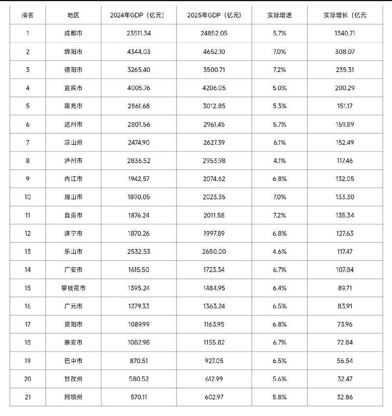 - 绵阳:作为四川第二大城市和唯一的中国科技城,其地位极其重要,将继续聚焦国防科工和电子信息产业,打造西部重要的先进制造业基地,是成都“虹吸效应”之外的重要科技支撑点。