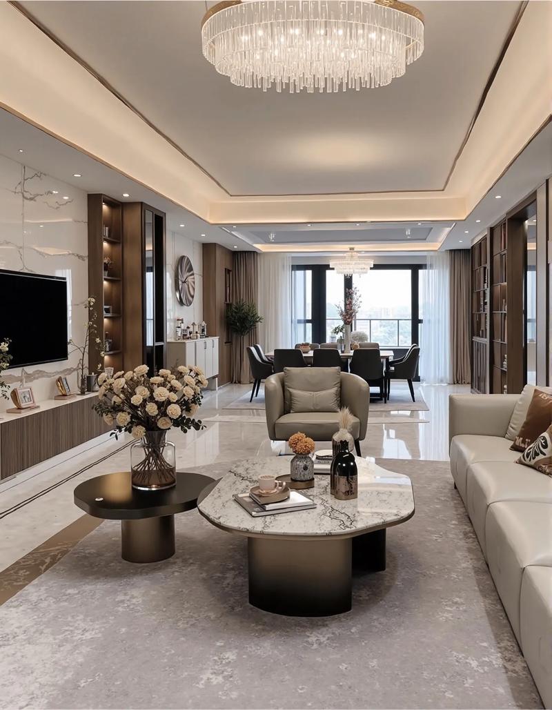 - 核心元素固化:轻奢风的设计语言依然围绕着“简约、精致、高级感”,它通常运用中性色(如米白、浅灰、燕麦色)作为基调,辅以少量低饱和度的莫兰迪色或金属色(如黄铜、拉丝不锈钢)作为点缀,材质上,偏爱天然石材(大理石、岩板)、实木、皮革、布艺和金属的结合。