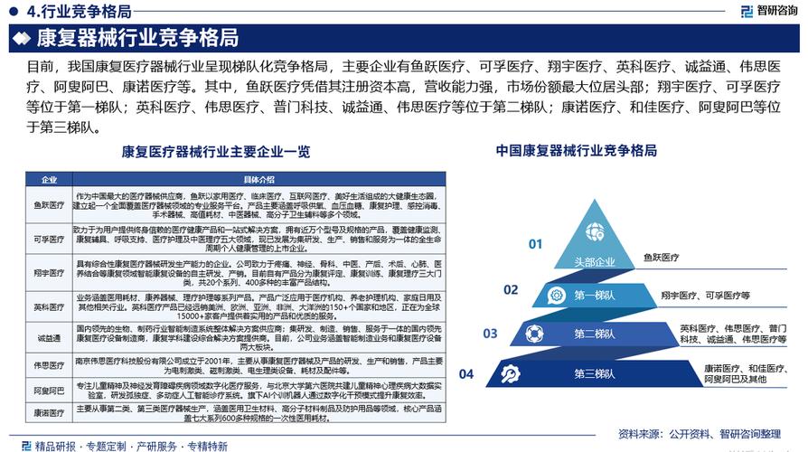 - 上游:康复器械与耗材、康复药品、康复信息化系统: 这是康复医学的物质基础和技术支撑,随着康复需求的升级,对高端、智能、个性化的康复器械和耗材的需求将持续增长。
