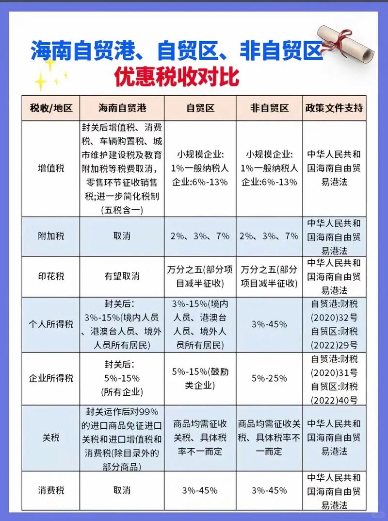 - 企业所得税: 对注册在海南并实质性运营的企业,鼓励类产业企业减按15%征收;在特定区域(如洋浦保税港区)设立的企业,进一步享受更优惠的政策。