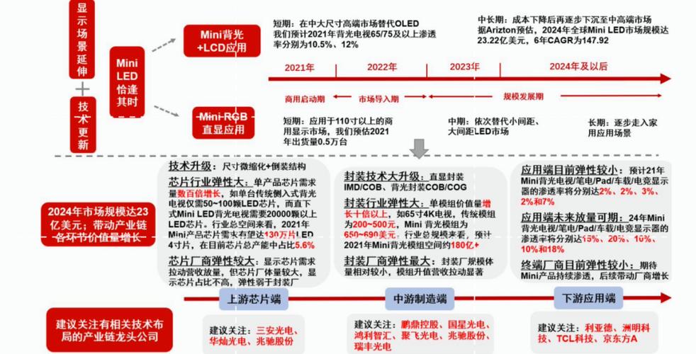 - 长期(5年以上): “Mini LED是Micro LED的跳板”,Mini LED的成功将培养市场,积累供应链经验,为最终向Micro LED过渡铺平道路,Micro LED被视为终极显示技术,但其量产仍需时日。